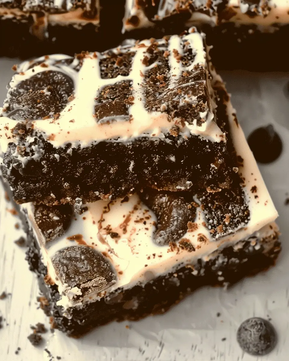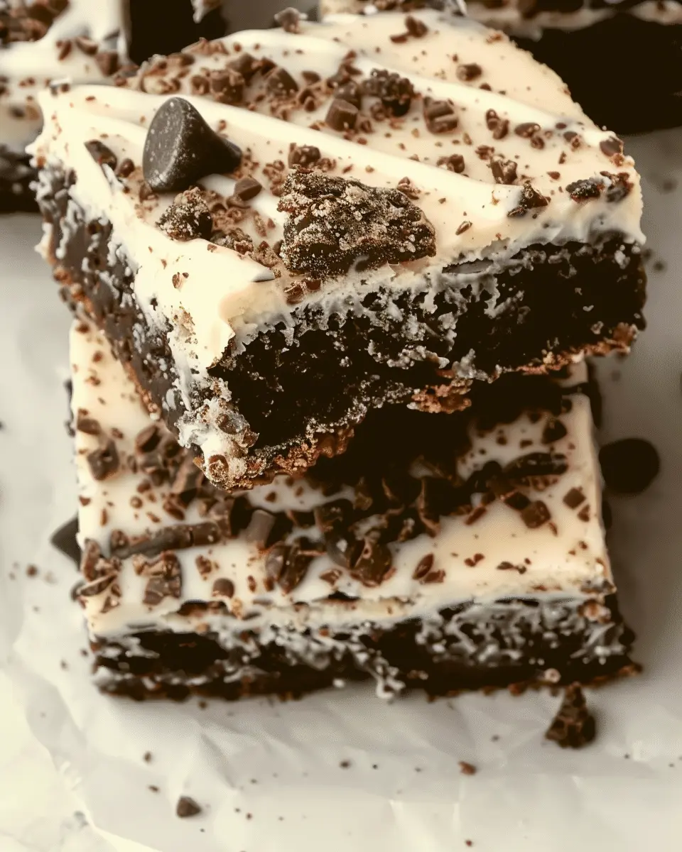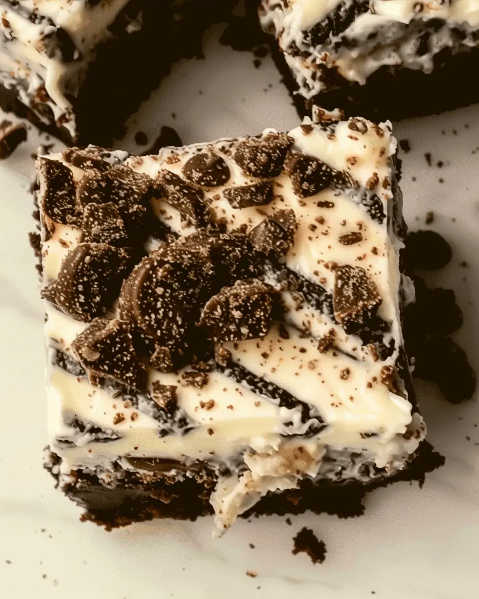Don’t forget to sprinkle the remaining crushed cookies on top for that crunchy finish! Finally, let the assembled brownies chill in the refrigerator for at least half an hour. This helps the cream layer set up nicely and makes cutting easier.