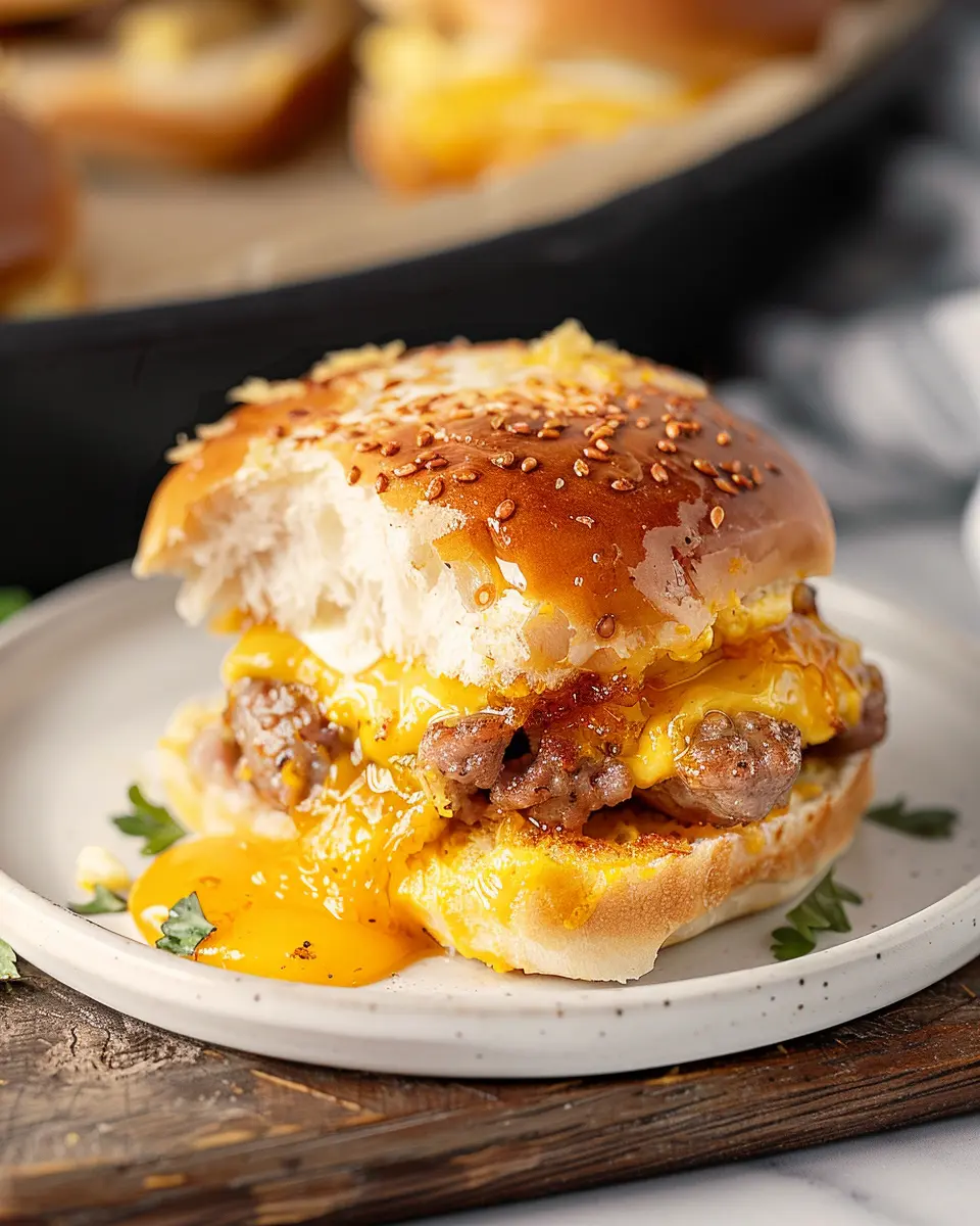 - Assemble the sliders by placing a sausage patty, a slice of cheese, and a portion of scrambled eggs onto each slider bun.