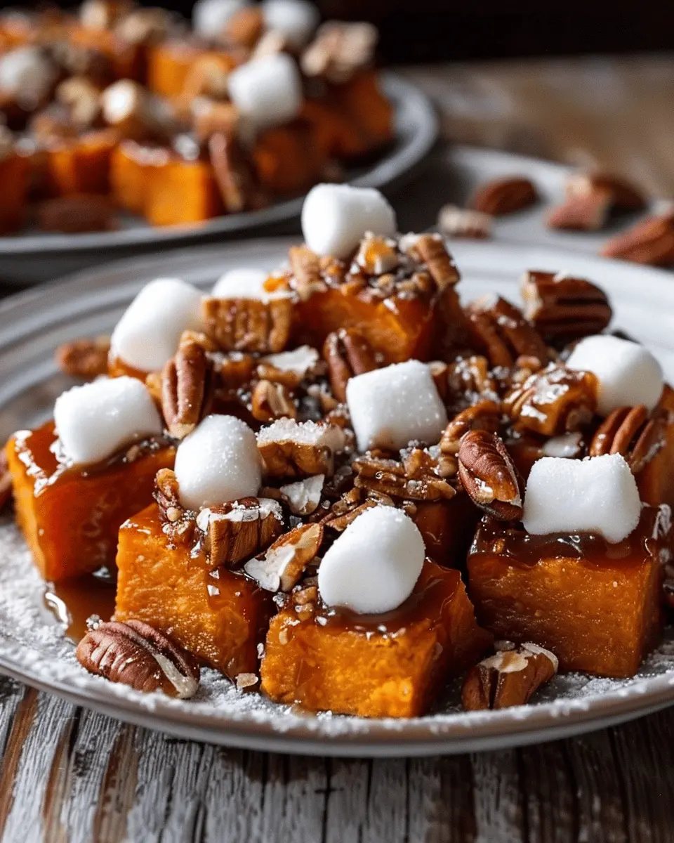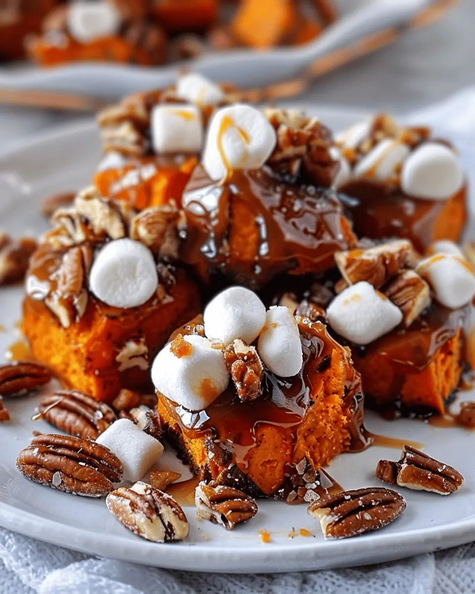 Delicious caramelized sweet potato bites topped with rich brown sugar marshmallows and crunchy pecans for a perfect indulgent treat.