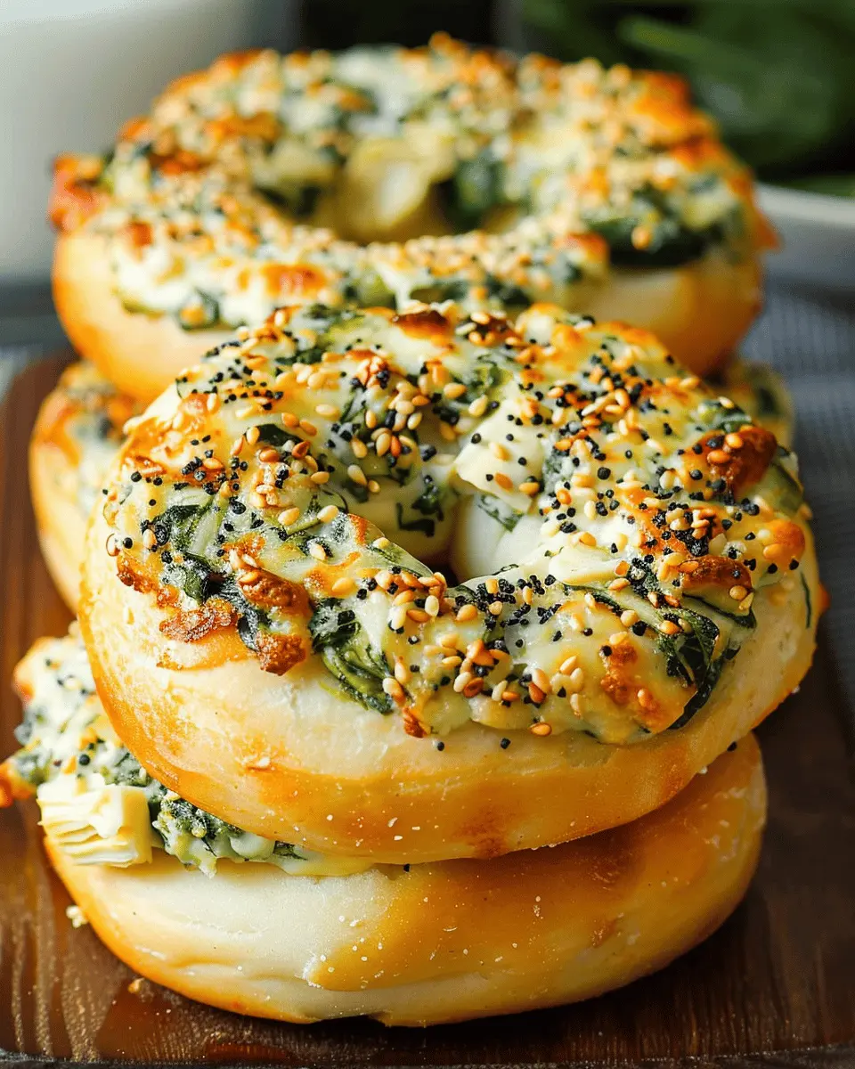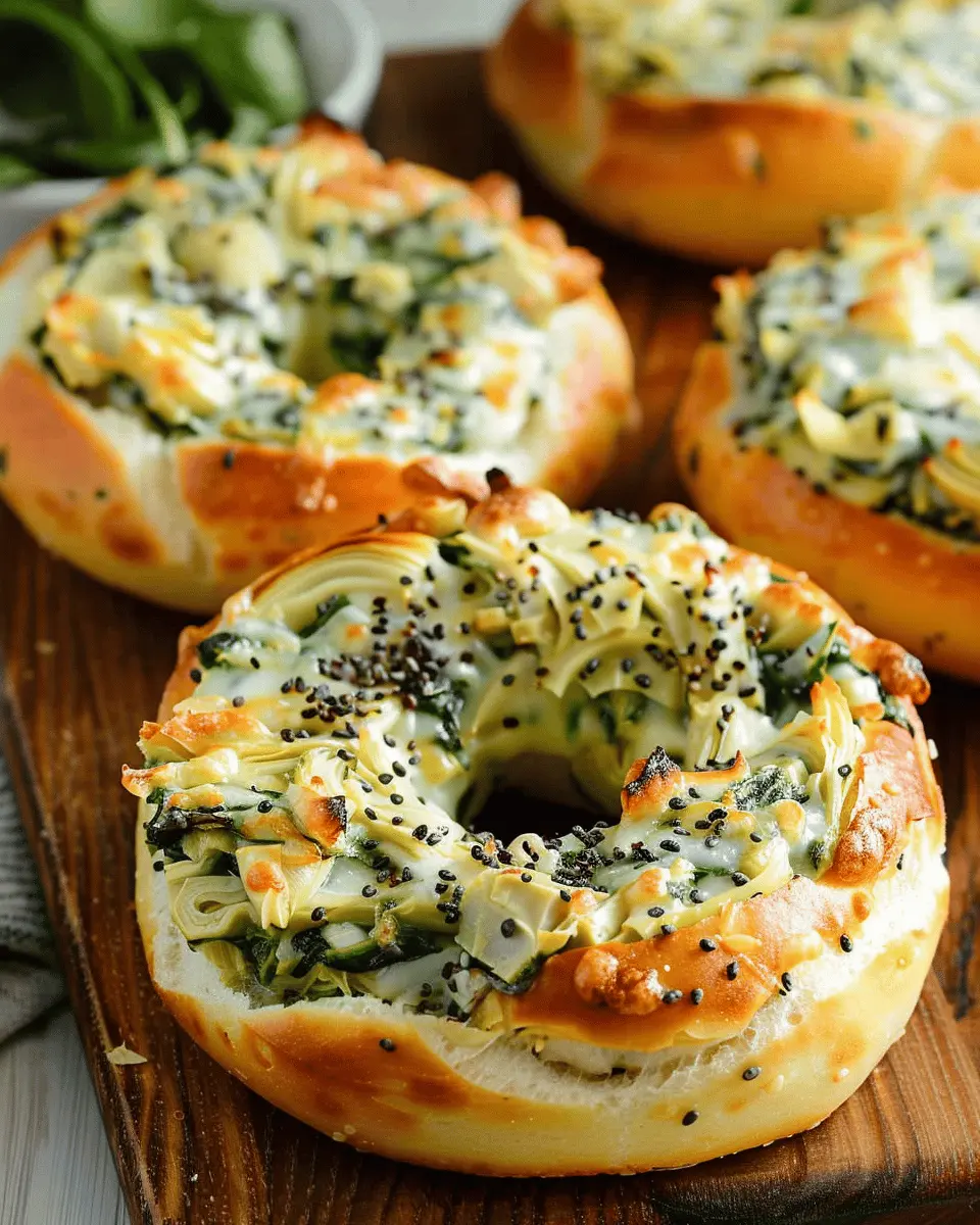 These Cheesy Spinach Artichoke Bagels are a delicious homemade snack that combines the savory flavors of spinach and artichoke with the delightful chewiness of fresh bagels. Perfect for any occasion!
