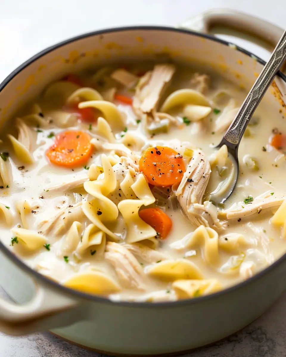In summary, this creamy chicken noodle soup recipe isn’t just a meal; it’s a comforting hug in a bowl. It’s perfect for quick weeknight dinners or lazy Sundays when you need something warm and satisfying. The combination of tender chicken, vibrant vegetables, and a luscious creamy broth makes for an irresistible dish that everyone will love.