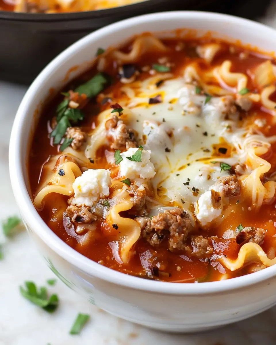 When the noodles are tender and the soup is bubbling, ladle it into bowls and finish with your toppings of choice. This is the moment where your easy lasagna soup transforms into a culinary warm hug. Garnish with fresh herbs for that wow factor, and enjoy your creation with a slice of crusty bread.