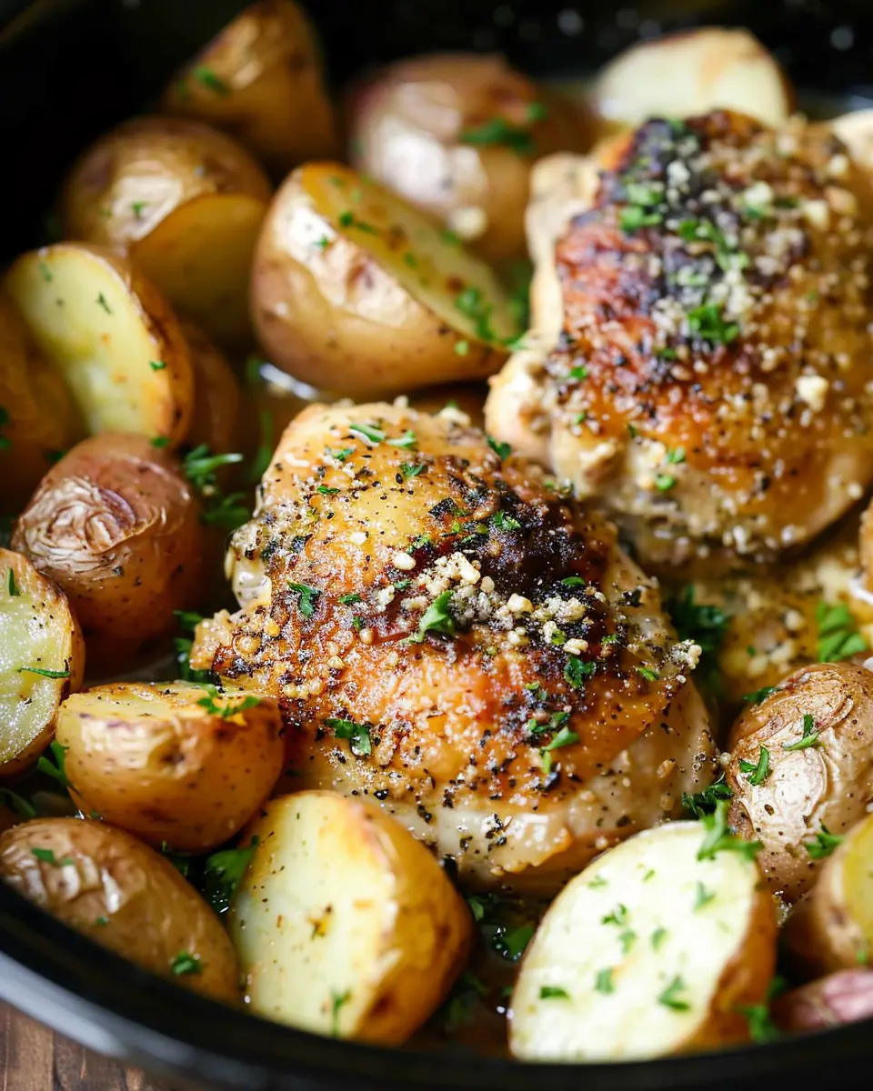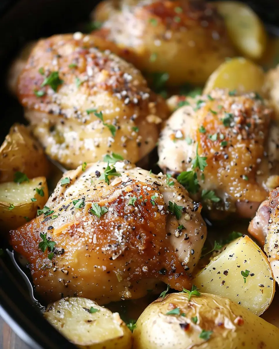 Enjoy the mouthwatering flavors of this Garlic Parmesan Crockpot Chicken and Potatoes recipe that combines ease and comfort food in one dish.