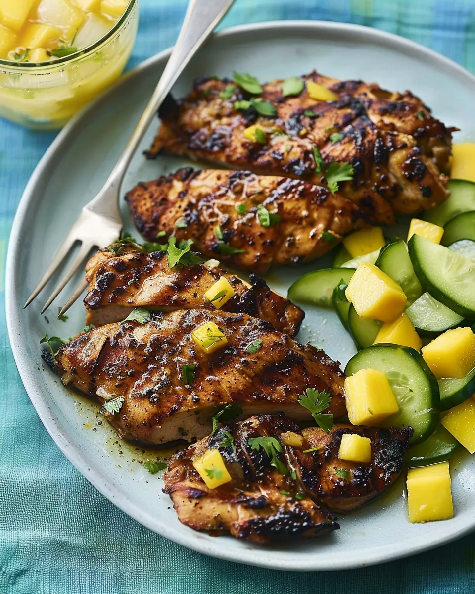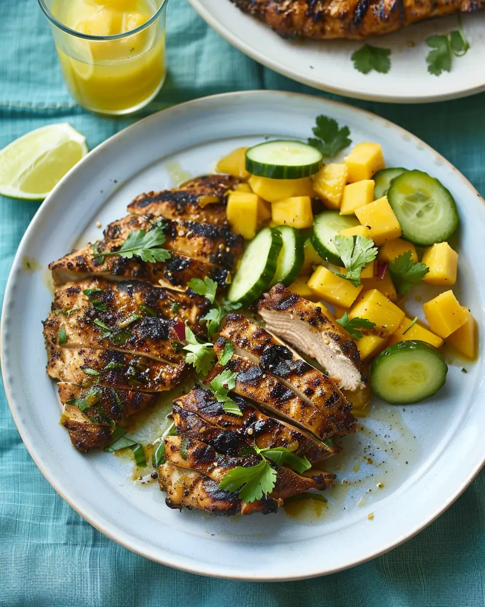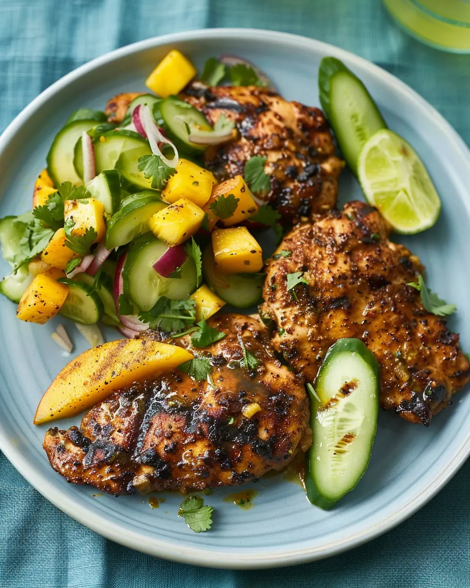 Experience a burst of flavors with this Grilled Jerk Chicken served with a refreshing Mango Cucumber Salad. Perfect for summer barbecues!