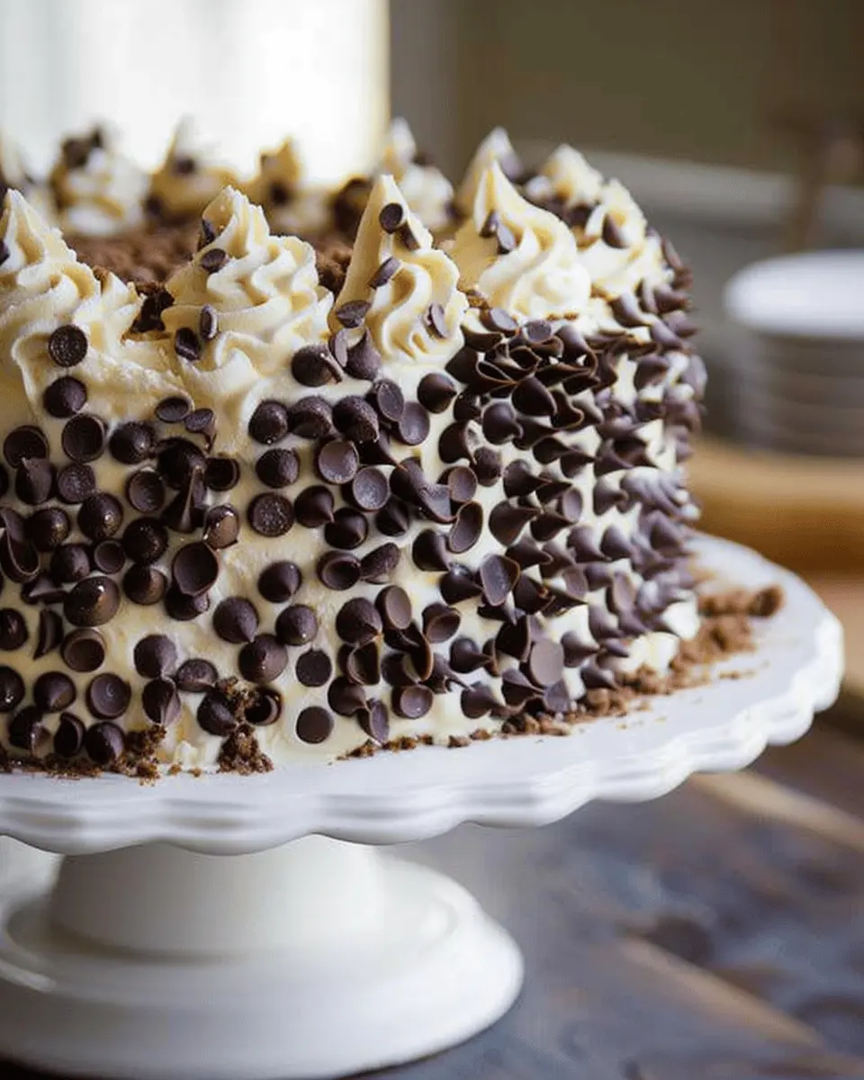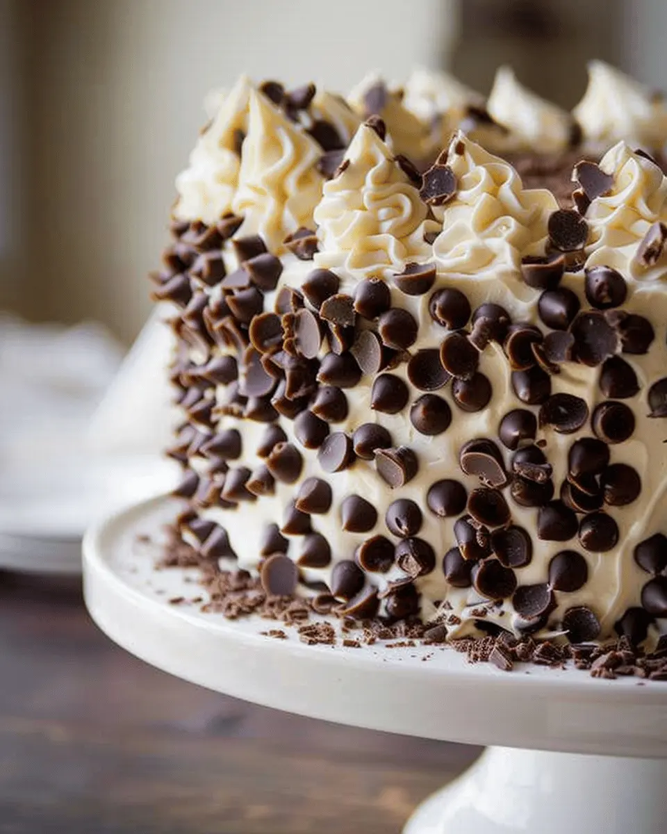 Now comes the best part—assembly! Take one of the cooled cake layers and spread a layer of cannoli cream filling on top. Place the second layer on top, then frost the entire cake with your whipped frosting. Feel free to garnish with more mini chocolate chips or even some crushed pistachios for a visual and textural contrast.