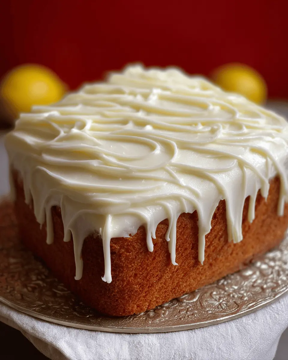 A delicious and moist lemon pound cake topped with creamy lemon cream cheese icing.