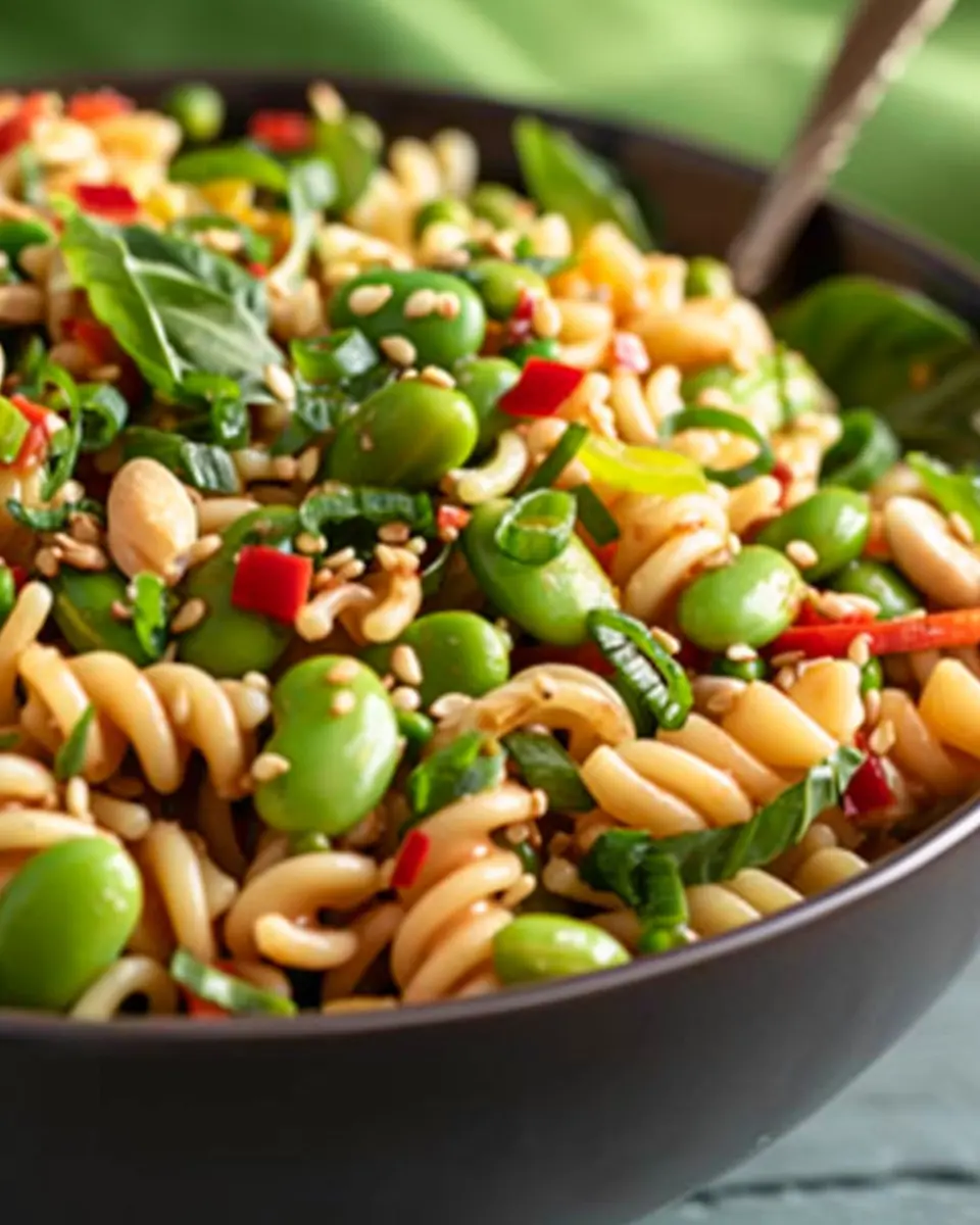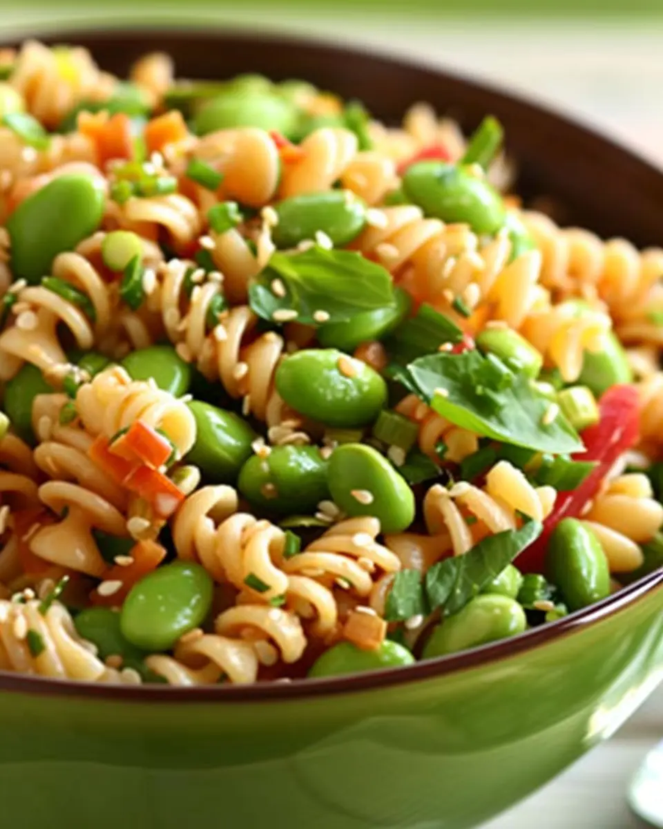 A deliciously simple salad featuring the vibrant flavors of sesame and soy, combined with tender edamame and pasta for a refreshing dish.