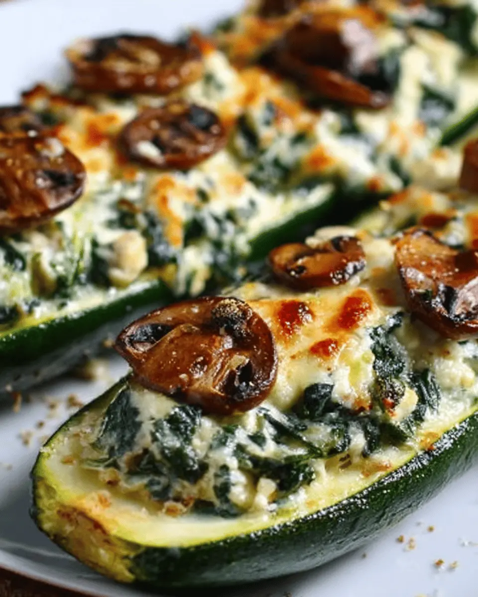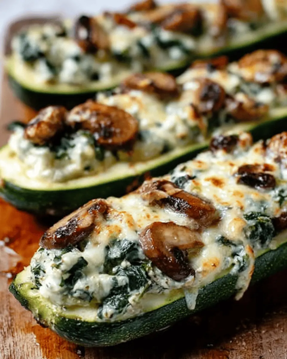 A delicious and healthy dish featuring fresh zucchini stuffed with a flavorful mixture of spinach, mushrooms, and ricotta cheese.