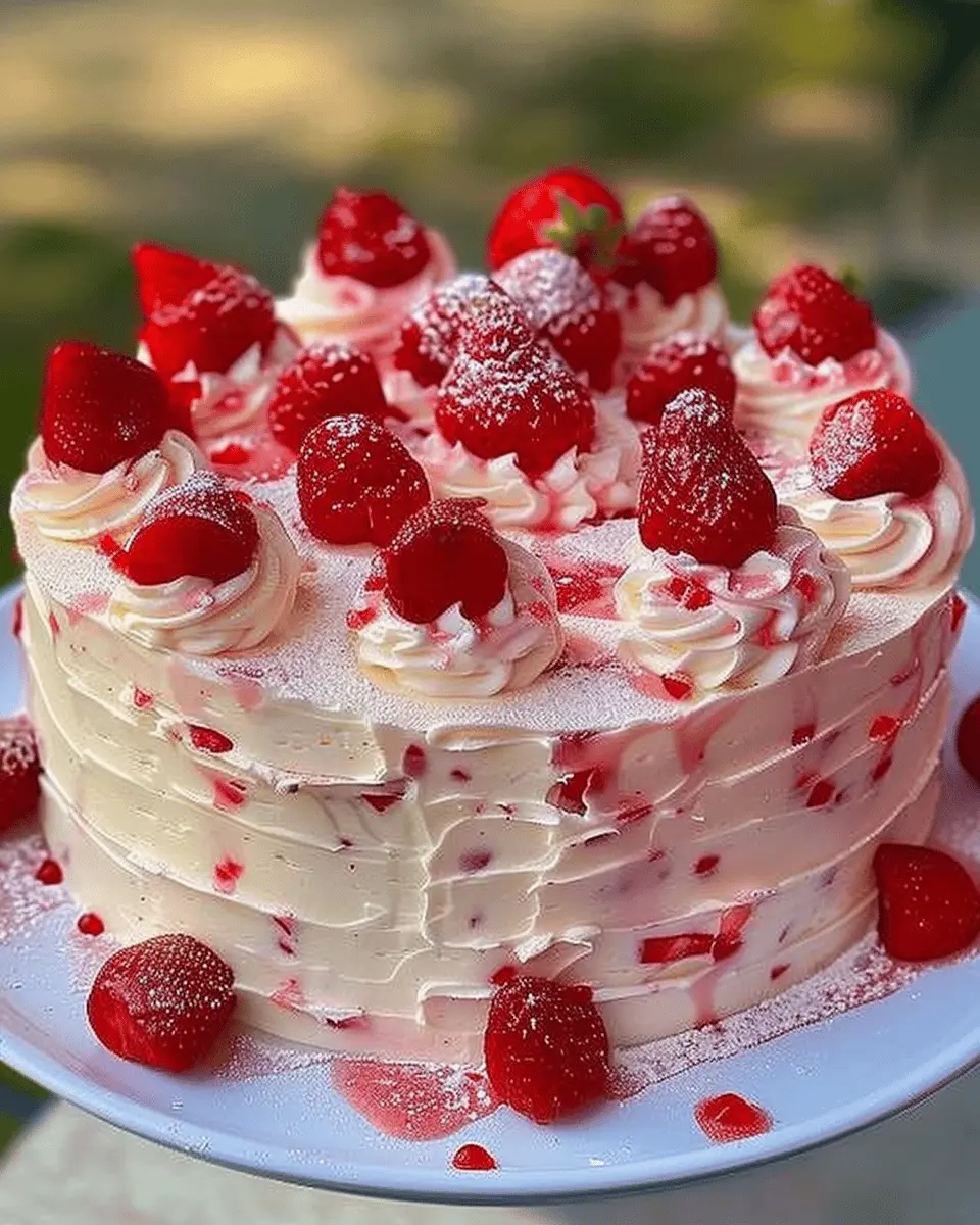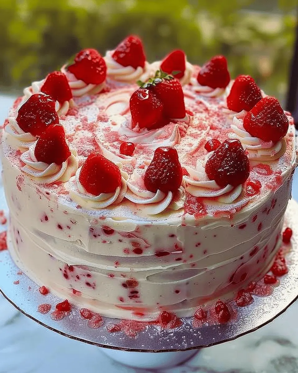 Once your cake has completely cooled, it’s time to frost! Place the cooled cake on a serving plate and generously spread the strawberry cream cheese frosting over the top and sides. You can be creative here—add fresh strawberries on top for extra decoration!