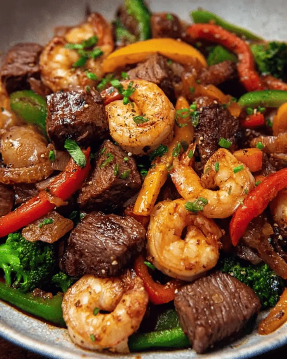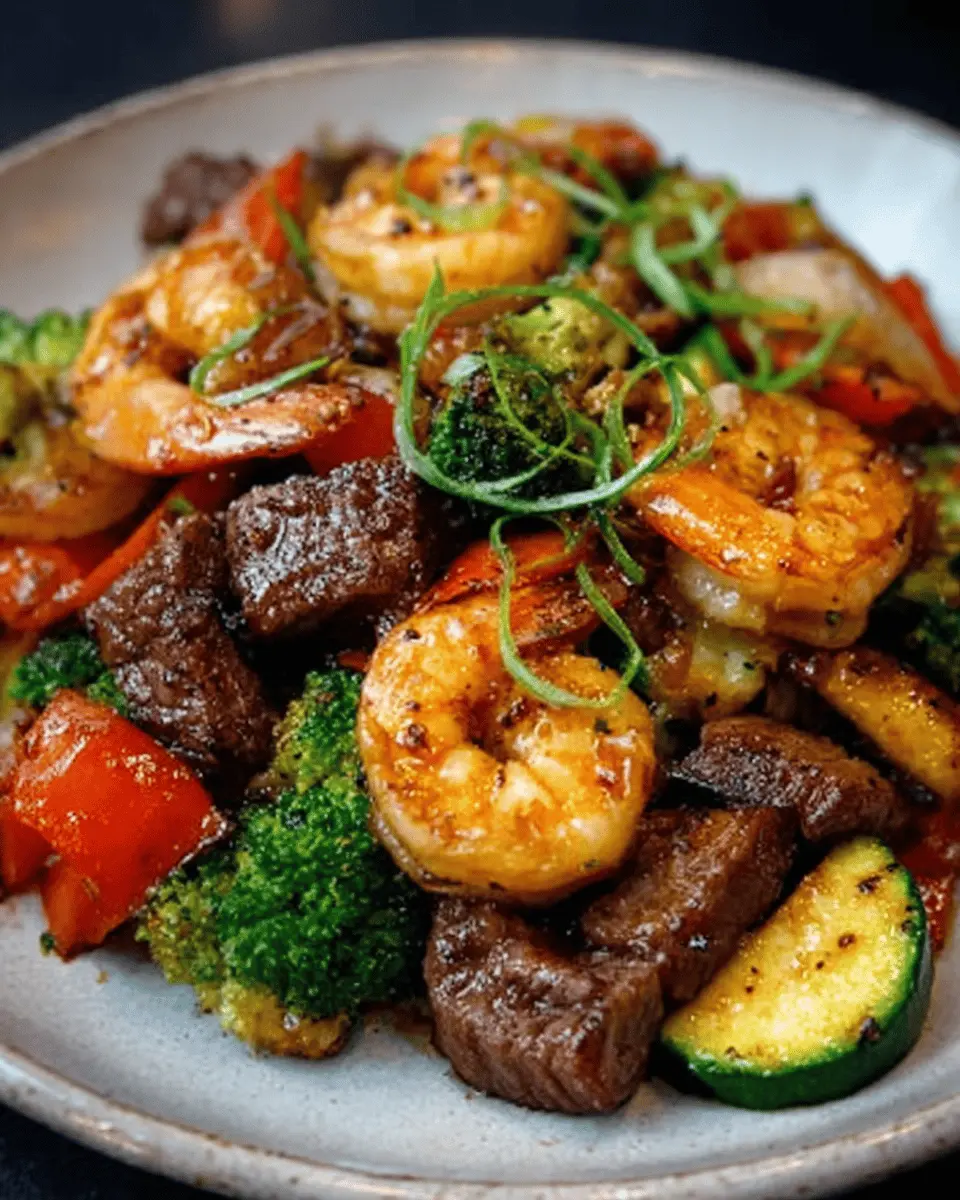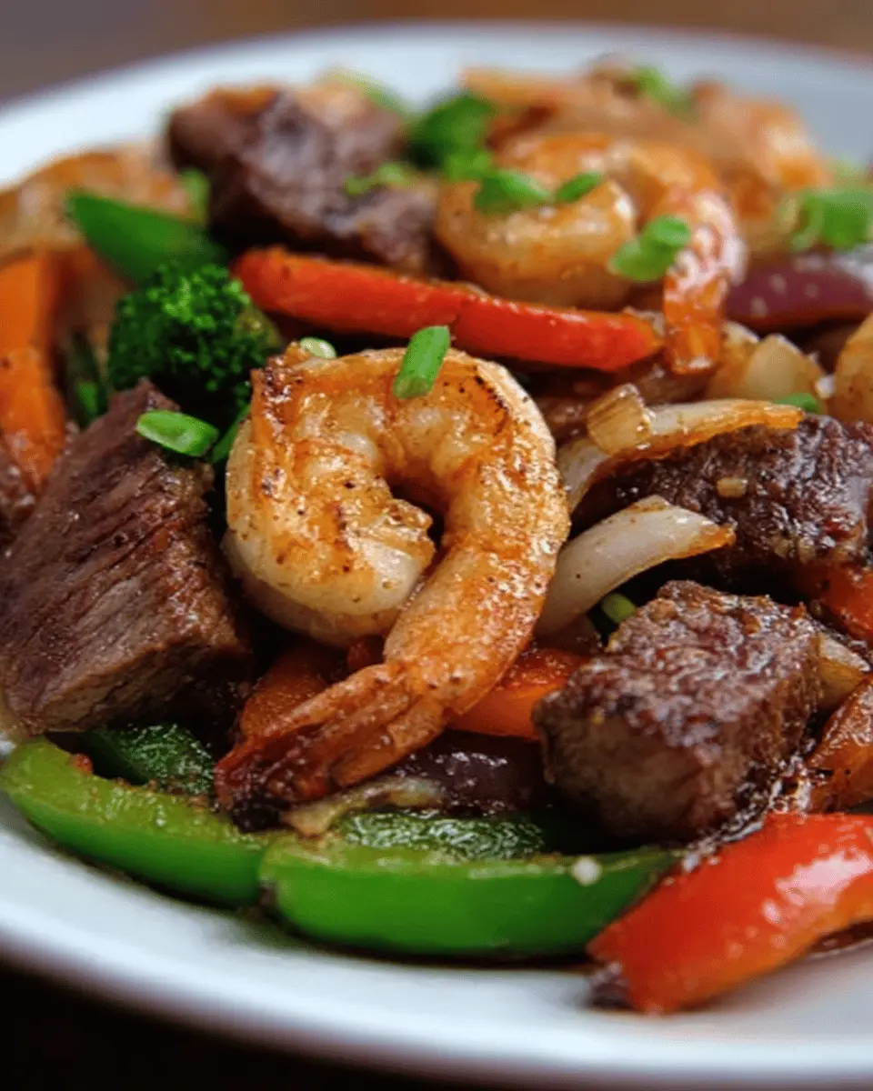 A delicious twist on classic surf and turf, combining both seafood and beef into a harmonious stir-fry.