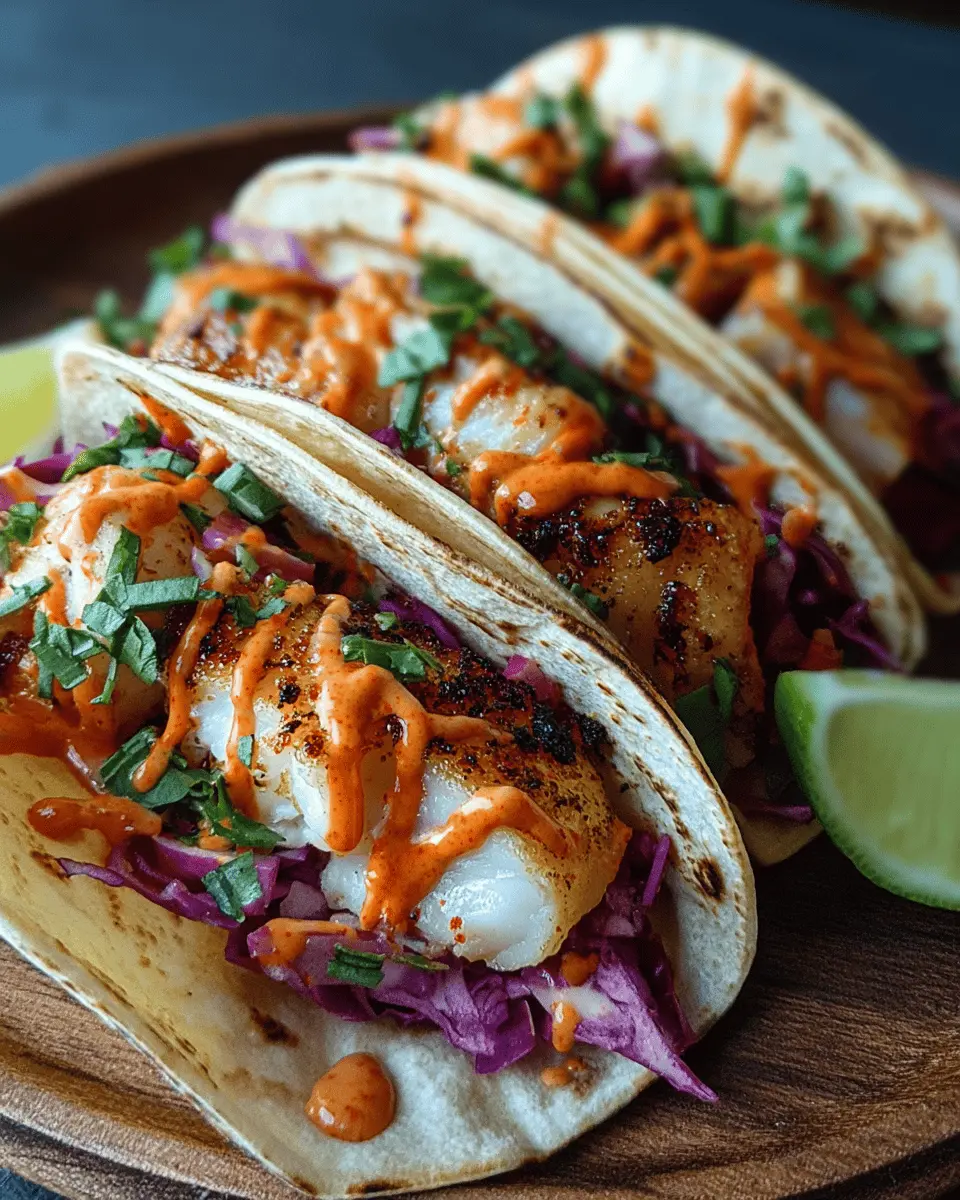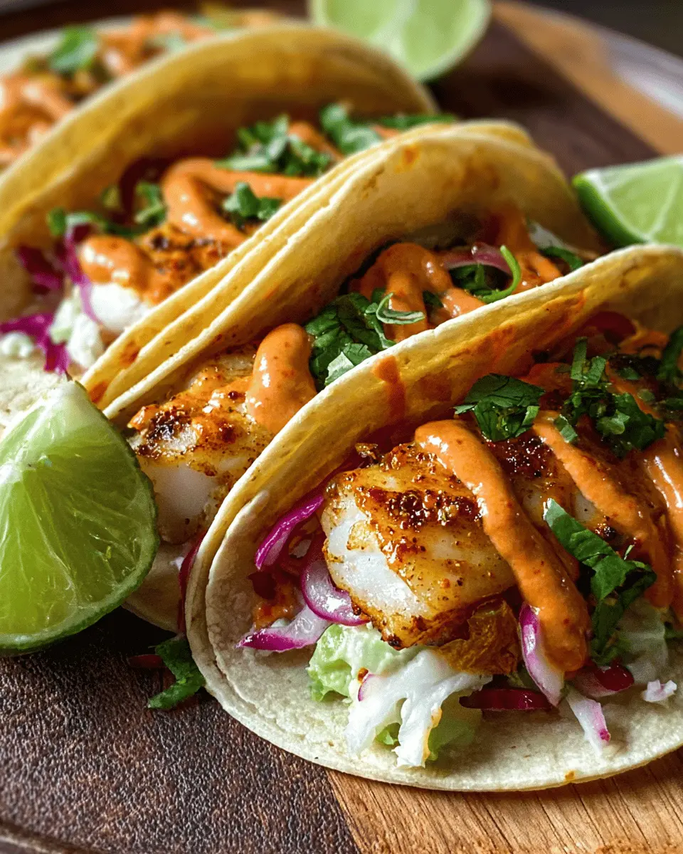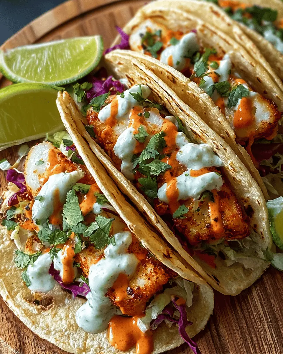 Experience the vibrant flavors of these zesty fish tacos topped with a spicy Sriracha lime sauce. Perfect for a weeknight dinner or a weekend gathering!